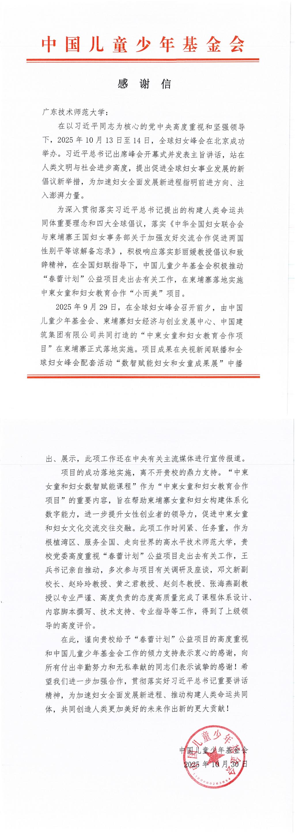 中國兒童少年基金會向我校發來感謝信 贊譽我校在中柬女童和婦女教育合作項目中貢獻突出